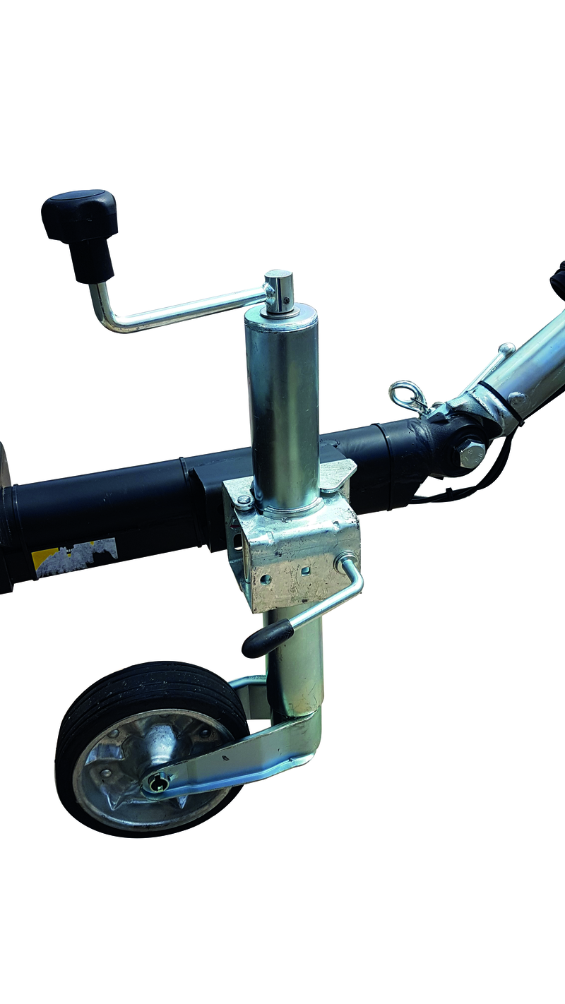 - Timon articulé réglable en hauteur équipé d’un attelage à boule et d’une roue jockey